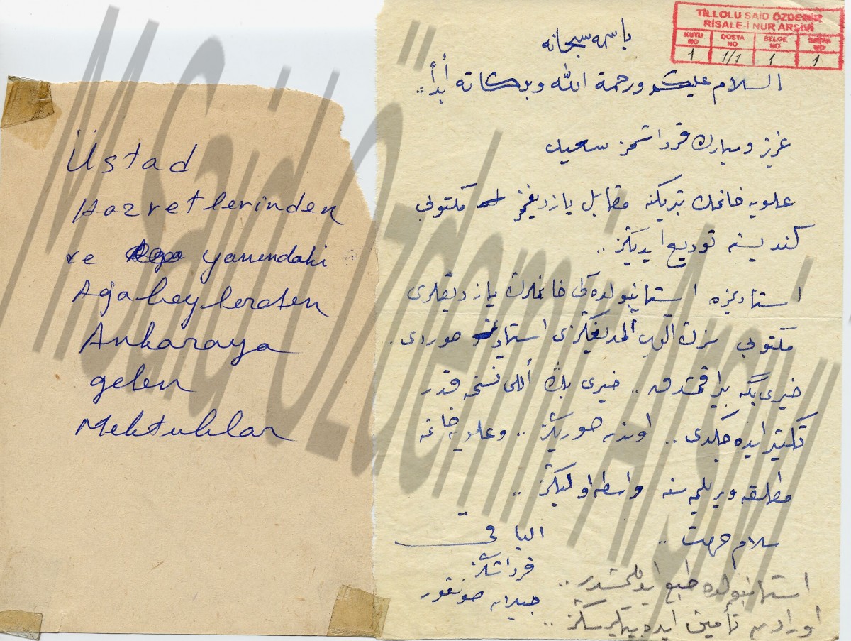 Üstad Hazretlerinden ve yanımdaki ağabeylerden Ankara'ya gelen mektuplar. Âlime Hanımın tebriğine verilen cevapla ilgili mektub,