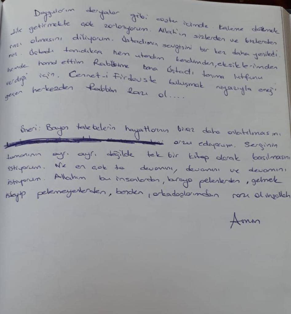 Duygularım deryalar gibi coştu içimde. Kaleme dökmek, dile getirmekte çok zorlanıyorum. Allah’ın sizlerden ve bizlerden razı olmasını diliyorum. Üstadımın sevgisini bir kez daha yenilediniz. Üstadı tanıdıkça hem utandım kendimden, eksikliklerimden hem de hamd ettim Rabbime bana tanıma lütfunu verdiği için. Cennet-i Firdevs’te buluşmak niyazıyla emeği geçen herkesten Rabbim razı ol…