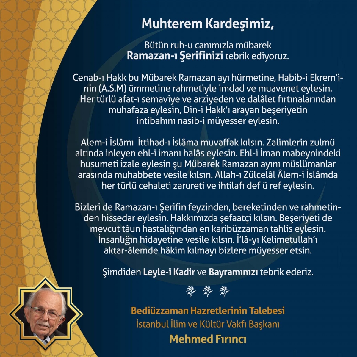 Bütün ruh u canımızla mübarek Ramazan-ı Şerifinizi tebrik ediyoruz. Cenab-ı Hakk bu Mübarek Ramazan ayı hürmetine, Habib-i Ekrem’inin (A.S.M) ümmetine rahmetiyle imdad ve muavenet eylesin. Her türlü afat-ı semaviye ve arziyeden ve dalâlet fırtınalarından muhafaza eylesin, Din-i Hakk’ı arayan beşeriyetin intibahını nasib-i müyesser eylesin.