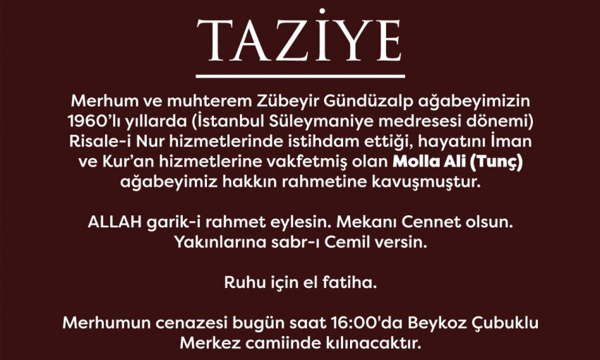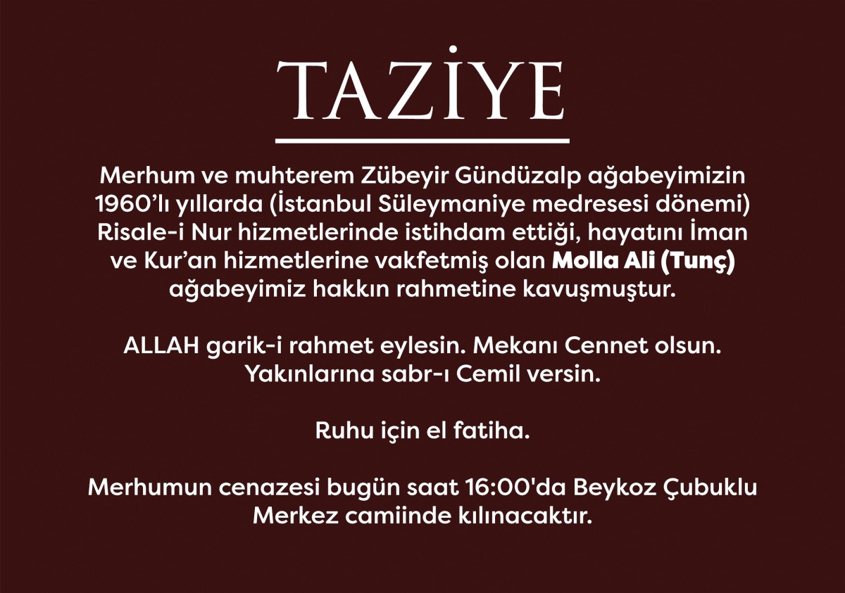 Merhum ve muhterem Zübeyir Gündüzalp ağabeyimizin 1960’lı yıllarda (İstanbul Süleymaniye medresesi dönemi) Risale-i Nur hizmetlerinde istihdam ettiği, hayatını İman ve Kur’an hizmetlerine vakfetmiş olan Molla Ali (Tunç) ağabeyimiz hakkın rahmetine kavuşmuştur.