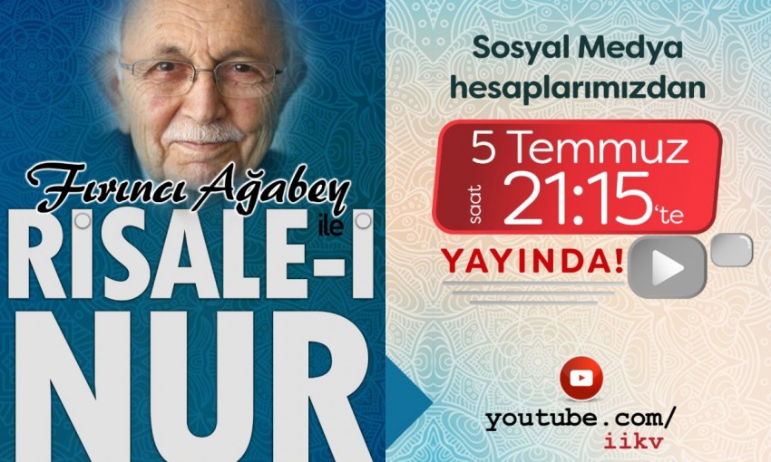Bu Pazar (5 Temmuz) 21.15'te Fırıncı Ağabey ile Risale-i Nur'dan "Her nefis ölümü tadacaktır hakikati, ahiret yolculuğu nasıl ve nereye doğru olacağı" 17. Lem'a'nın 2,3,4,5. notalarından okunacak.