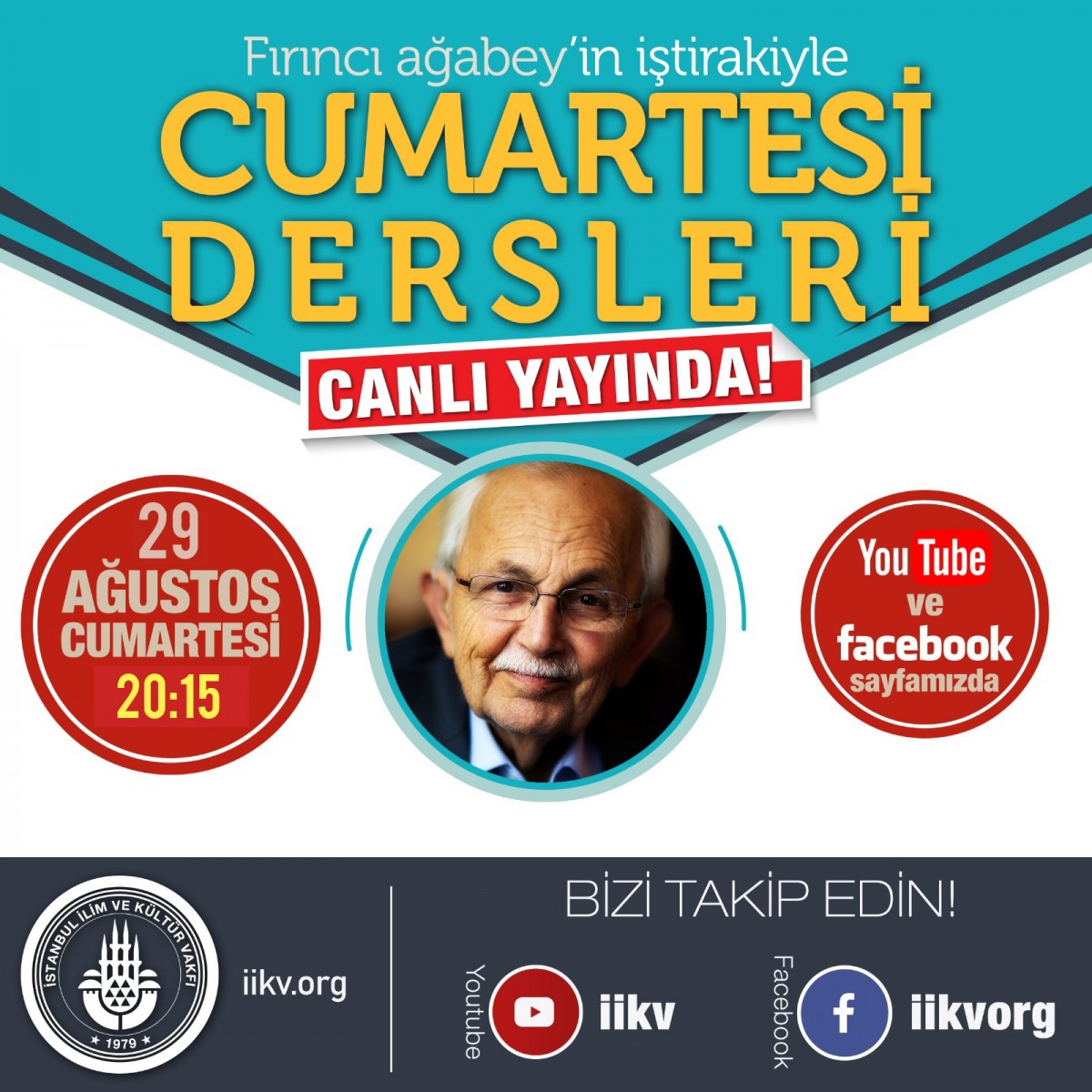 Pazar günleri devam eden Fırıncı ağabey ile Risale-i Nur Dersleri, yeni gün ve saatiyle cumartesi günleri saat 20.15'te Rüstempaşa Medresesi’nden canlı olarak yapılmaya devam edilecektir. Bu haftaki ders CUMARTESİ (29 Ağustos) 20:15’te yapılacaktır.