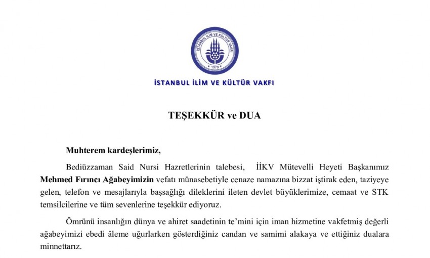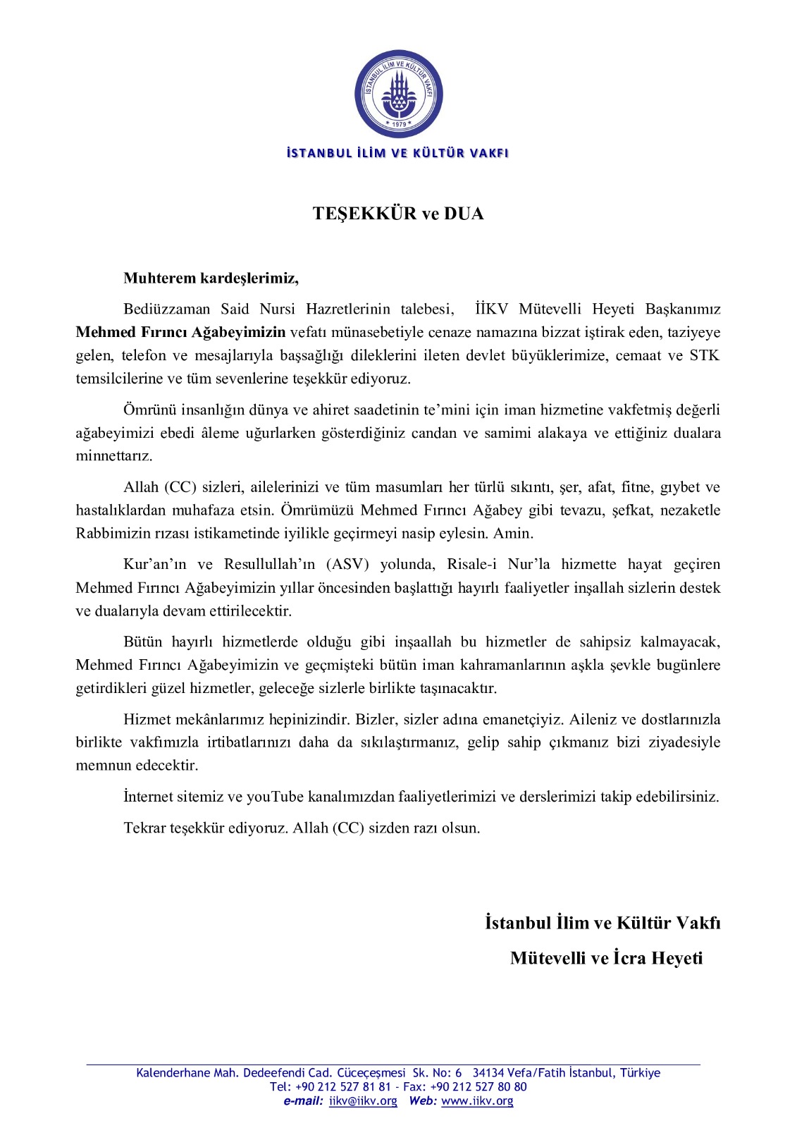 Üstad Bediüzzaman Said Nursi Hazretlerinin ahir ömründe hizmetinde bulunmuş, Risale-i Nurların muhtaç gönüllere ulaştırılmasında mühim vazifeler deruhte etmiş ve azim bir gayret ile ömrünün son demlerine kadar hizmete koşan, cevval, yüksek hamiyetli ve fedakâr Mehmet Fırıncı Ağabeyimizi Cenab-ı Hak cennet ve cemali ile müşerref etsin ve Resul-u Ekrem Efendimize komşu eylesin.