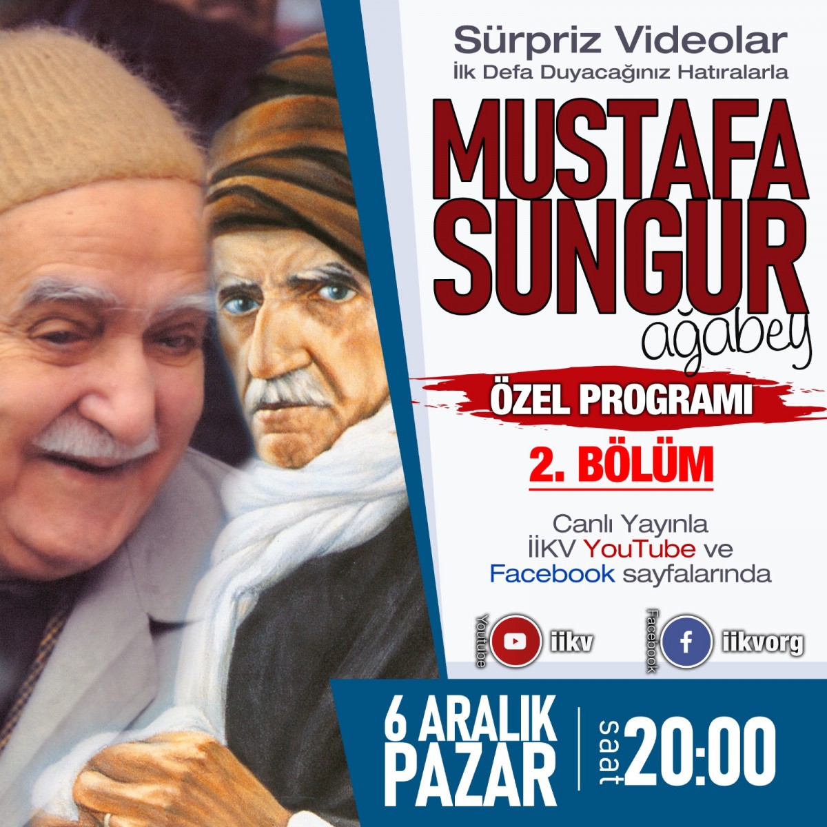 Geçen haftaki "Mustafa Sungur Ağabey Özel Programı" dersimize göstermiş olduğunuz yoğun ilgiden dolayı teşekkür ederiz. Bir çok izleyicimizden programın ikinci bölümü için rica mesajları aldık. Programın ikinci bölümünü bu akşam (6 Aralık Pazar günü) 20.00’da İİKV’nin YouTube kanalından yayınlayacağız.