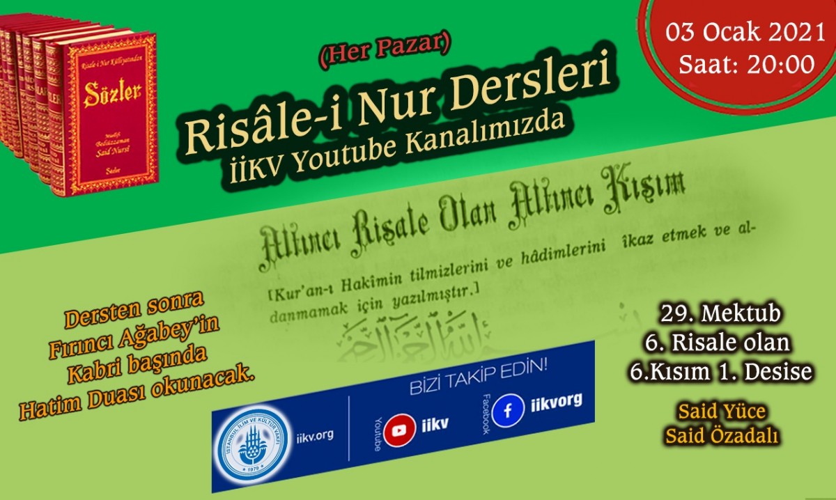 Her pazar devam eden Risâle-i Nur dersimiz 3 Ocak 2021 (bu akşam) Pazar 20.00'de yapılacaktır. Canlı yayında "29. Mektup / 6. Kısım / 1.Desise" okunacak. Dersten sonra Fırıncı Ağabey'in kabri başında Hatim Duası okunacak. Yayını aşağıdaki linkten izleyebilirsiniz.