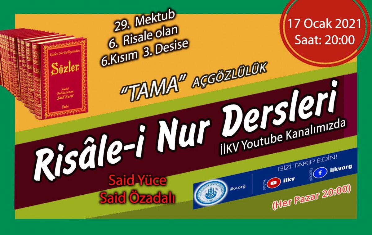 Canlı yayında "29. Mektup / 6. Kısım / 3. Desise" okunacak. Dersten sonra vakfımızın son 2 yıllık faaliyetleri sunulacaktır.