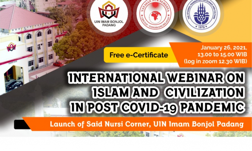 Endonezya İmam Bonjol Devlet İslam Üniversitesi-Padang, Yayasan Nur Semesta Jakarta and İstanbul İlim ve Kültür Vakfı ortaklaşa olarak 26 Ocak 2021 Salı günü Kovid-19 Pandemi Sonrasında İslam ve Medeniyet konulu uluslararası bir webiner düzenlemektedir.