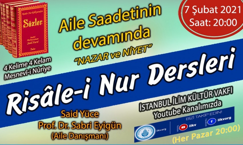 Her pazar devam eden Risâle-i Nur dersimiz 7 Şubat 2021 (bu akşam) Pazar 20.00'da yapılacaktır.