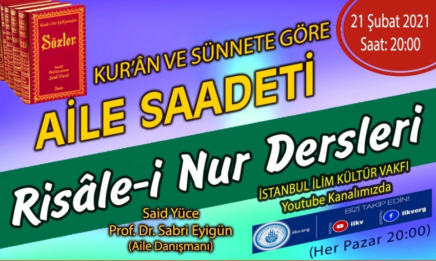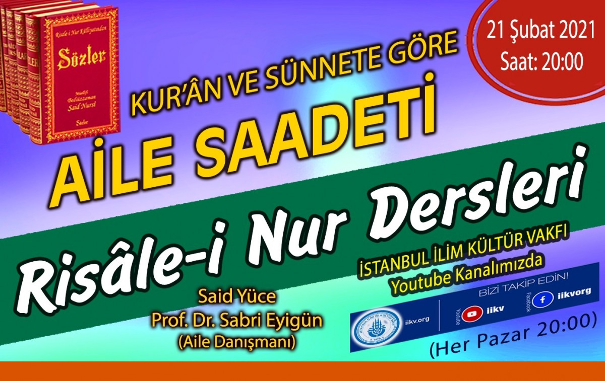 Her pazar devam eden Risâle-i Nur dersimiz 21 Şubat 2021 Pazar (bu akşam) 20.00'da yayında! Canlı yayında "Aile Saadeti" dersi yapılacaktır. Yayını aşağıdaki linkten izleyebilirsiniz