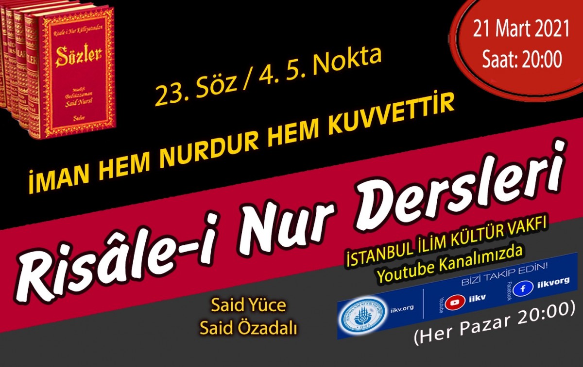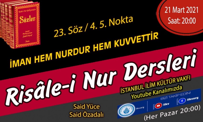Her pazar devam eden "NURDAN DAMLALAR" Risâle-i Nur dersimiz 21 Mart 2021 Pazar (bu akşam) 20.00'da yayında! Canlı yayında "23. Söz/ 4.-5. Nokta (İman hem nurdur hem kuvvettir) " dersi okunacaktır. Kanalımıza abone olmayı unutmayınız https://