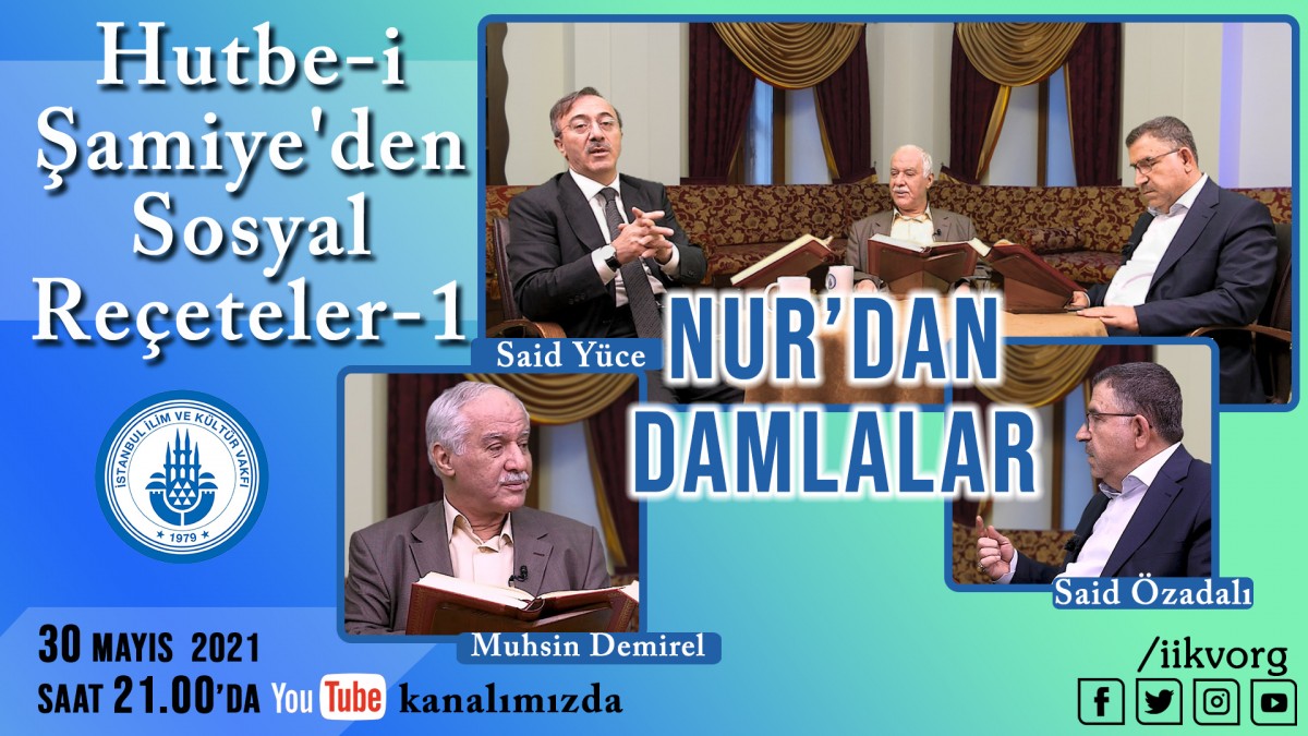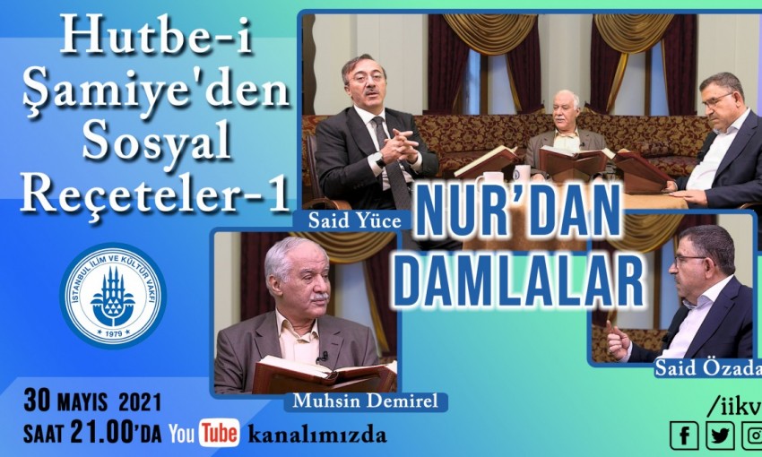 Her pazar devam eden "NUR’DAN DAMLALAR" Risâle-i Nur dersimiz bu akşam (30 Mayıs) 21.00'da yayında! Canlı yayında "Hutbe-i Şamiye'den Sosyal Reçeteler-1" dersi okunacaktır. YouTube kanalımıza abone olmayı unutmayınız. https://