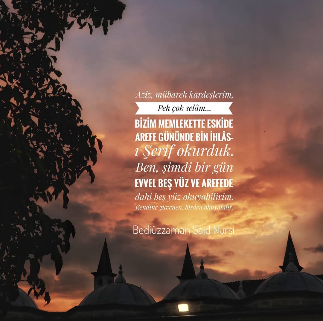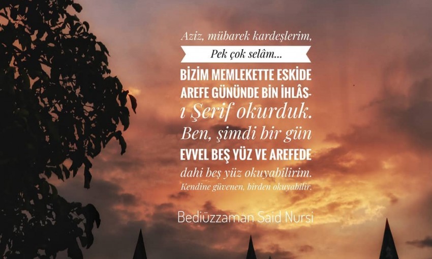 Pek çok selâm... Bizim memlekette eskide arefe gününde bin İhlâs-ı Şerif okurduk. Ben, şimdi bir gün evvel beş yüz ve arefede dahi beş yüz okuyabilirim. Kendine güvenen, birden okuyabilir. "