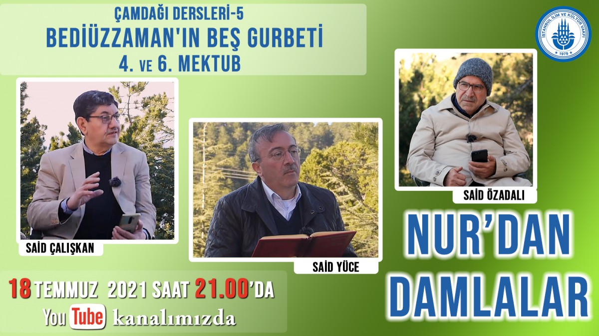Her pazar devam eden "NUR’DAN DAMLALAR" Risâle-i Nur dersimiz bu akşam (18 TEMMUZ) 21.00'da yayında! "Çamdağı Dersleri-5 / Bediüzzaman'ın Beş Gurbeti / 4. ve 6. Mektub" dersi okunacaktır. YouTube kanalımıza abone olarak bizlere destek olabilirsiniz gUFkI