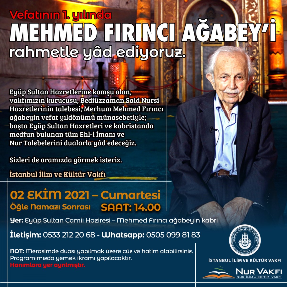 Eyüp Sultan Hazretleri'ne komşu olan, vakfımızın kurucusu, Bediüzzaman Said Nursi Hazretleri'nin talebesi Mehmed Fırıncı Ağabey'in vefat yıldönümü münasebetiyle; başta Eyüp Sultan Hazretleri ve kabristanda medfun bulunan tüm Ehl-i İmanı ve Nur Talebelerini dualarla yad edeceğiz.