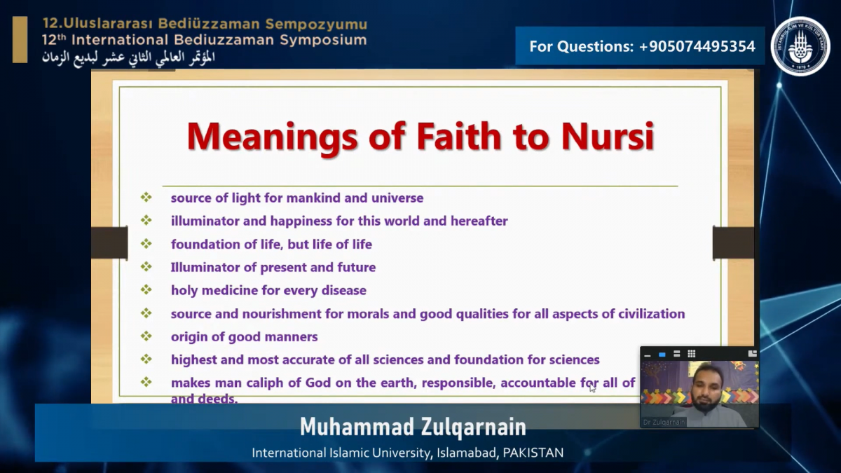 Pakistan İslamabad Uluslararası İslam Üniversitesi’nden Felsefe ve Akide üzerine çalışmalar yapmış olan Dr. Muhammad Zulqarnain 12. Uluslararası Bediüzzaman Sempozyumu'nda bir tebliğ sundu. Tebliğin konusu: "BEDİÜZZAMAN SAİD NURSİ'YE GÖRE İNANCIN ÇEŞİTLİ BOYUTLARININ YORUMU VE BUNUN MÜSLÜMAN TOPLUMLARIN YENİDEN UYANIŞI ÜZERİNE ETKİSİ"