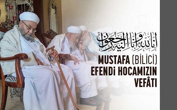 Mahmud Efendi Hazretlerinin Dîn-i Mübîn-i İslâm’a uzun yıllar birlikte hizmet ettiği kadîm dostu Mustafa (Bilici) Efendi vefât etmiştir. Kıymetli hocamıza Mevlâ Teâlâ’dan rahmet diliyor; ailesine, cemaatimize ve tüm sevenlerine sabr-ı cemîl, ecr-i cezîl niyâz ediyoruz.