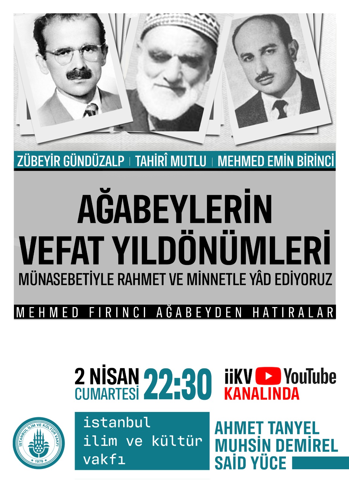 2 Nisan Cumartesi günü saat 22.30'da başlayacak olan Zübeyir Gündüzalp, Tahiri Mutlu, Mehmed Emin Birinci Ağabeyleri anma programımız iikv/Youtube kanalımızda yayınlanacaktır.
