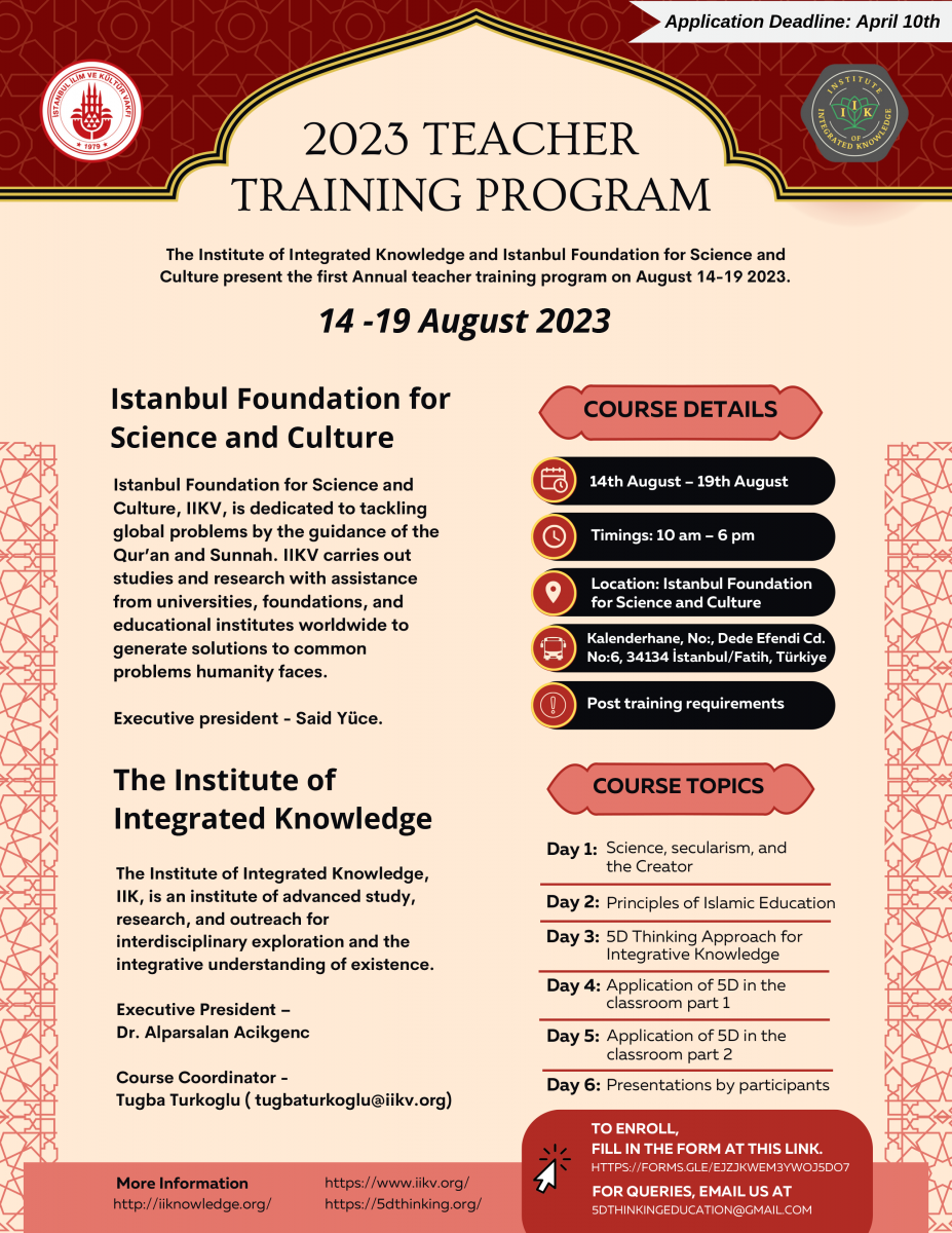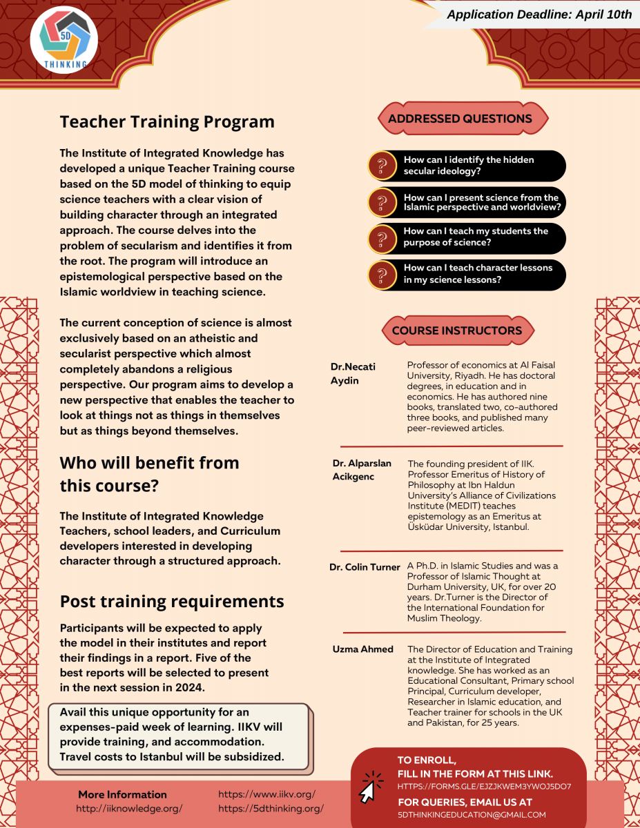 İlk kez 14-19 Ağustos 2023 tarihleri arasında gerçekleştirilecek ve dünyanın farklı ülkelerinden eğitimcilerin davet edileceği çalıştay, bilim öğretiminde hakim seküler zihinsel çerçevenin ötesine geçen yeni bir epistemolojik bakış açısı sağlamayı amaçlamaktadır. Bu amaç doğrultusunda, 5D düşünme yaklaşımı kullanılarak tevhidi dünya görüşü perspektifiyle eğiticilere yeni bir bilim felsefesi sunmayı hedeflemektedir.