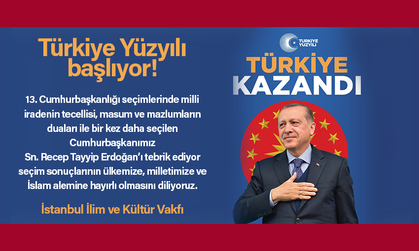 13. Cumhurbaşkanlığı seçimlerinde milli iradenin tecellisi, masum ve mazlumların duaları ile bir kez daha seçilen Cumhurbaşkanımız Sn. Recep Tayyip Erdoğan’ı tebrik ediyor seçim sonuçlarının ülkemize, milletimize ve İslam alemine hayırlı olmasını diliyoruz.