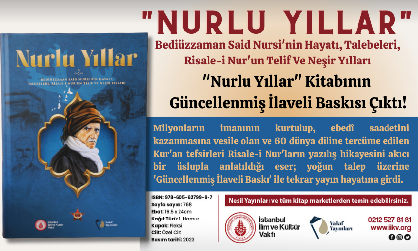 İstanbul İlim ve Kültür Vakfı (İİKV) tarafından yayınlanan "Nurlu Yıllar" adlı eserin ilaveli yeni baskısı, Bediüzzaman Said Nursi Hazretleri'nin hayatını, talebelerini ve Risale-i Nur'un telif ve neşir yıllarını daha derinlemesine anlatıyor. Kitap, milyonların imanının kurtulup ebedi saadetini kazanmasına vesile olan Kur'an tefsirleri Risale-i Nur'ların yazılış hikayesini akıcı bir üslupla sunuyor.