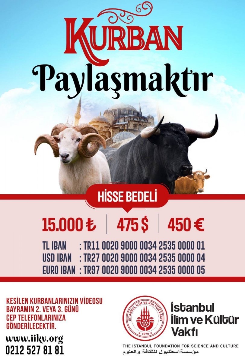 Vakfımızın 2024 Yılı Kurban hisse bedeli 15.000 TL / 450 Euro olarak belirlenmiştir.