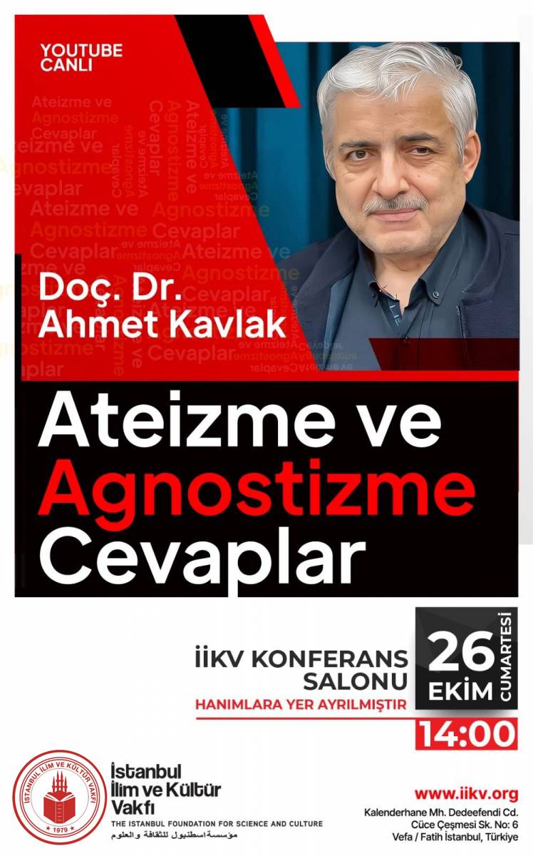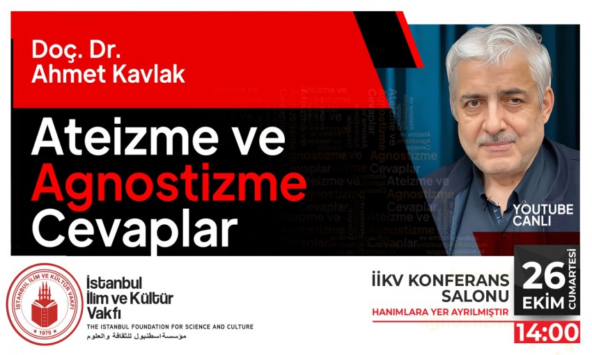 İstanbul İlim ve Kültür Vakfı (İİKV), 26 Ekim 2024 Cumartesi günü saat 14:00'te dikkat çekici bir konferans düzenliyor. "Ateizme ve Agnostizme Cevaplar" başlıklı programda Doç. Dr. Ahmet Kavlak, ateizm ve agnostisizm gibi kavramları İslamî perspektiften ele alacak ve bu düşünce akımlarına yönelik önemli cevaplar sunacak.