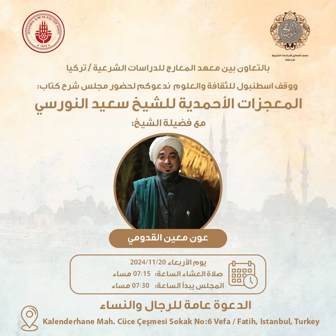 في إطار اتفاقية التعاون والتساند العلمي بين مؤسسة اسطنبول للثقافة والعلوم ومعهد معارج للدراسات الشرعية، نزل فضيلة الشيخ معين عون القدومي ضيفا على المؤسسة لعقد مجلس قراءة رسالة المعجزات الأحمدية للأستاذ بديع الزمان سعيد النورسي وذلك كل يوم إربعاء بحضور العديد من طلاب العلم والمهتمين برسائل النور.