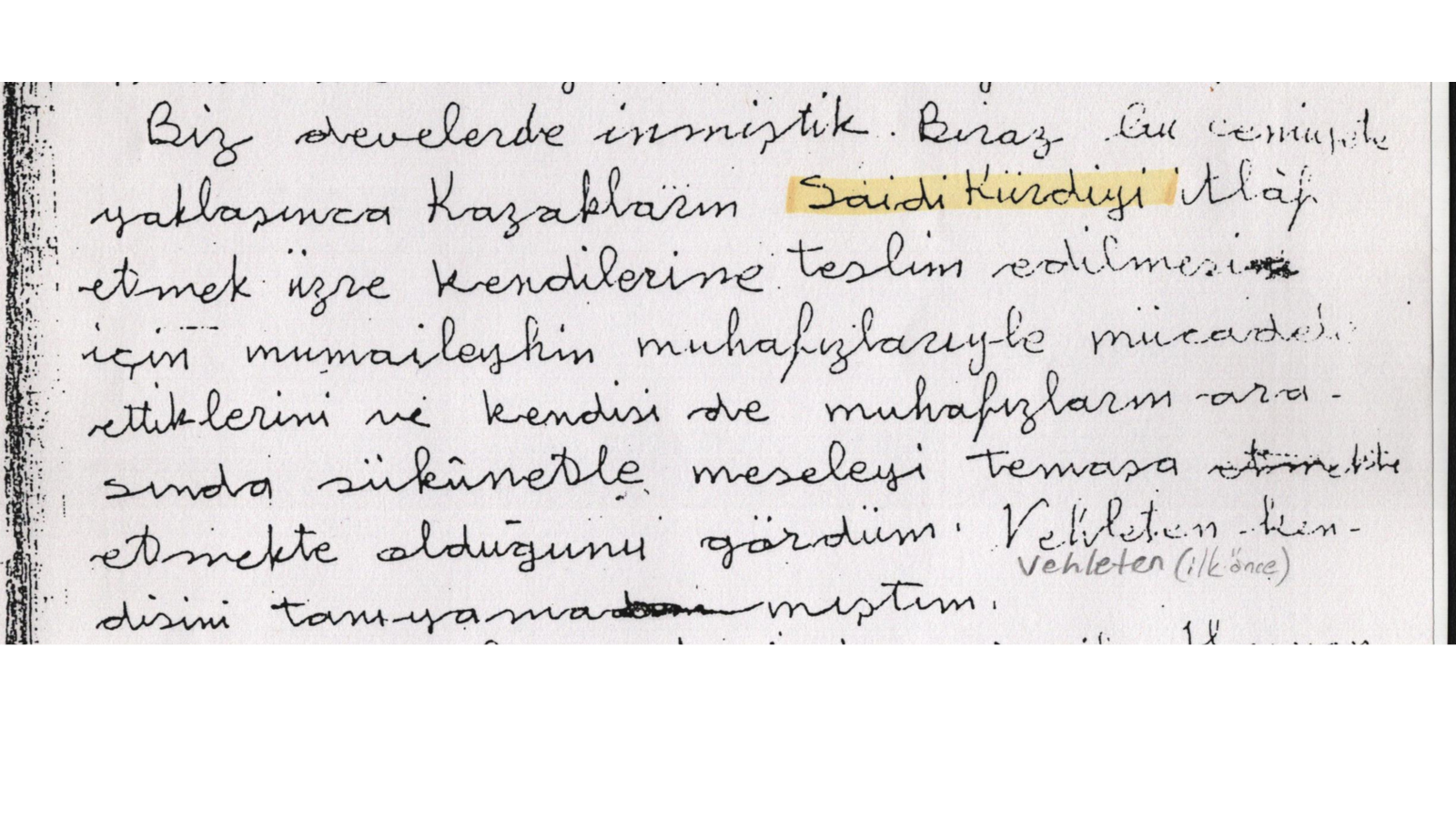 "Biz develerde inmiştik. Biraz bu cemiyete yaklaşınca Kazakların Saidi Kürdiyi itlaf etmek üzre kendilerine teslim edilmesi için mumaileyhin muhafızlarıyla mücadele ettiklerini ve kendisi de muhafızların arasında sükûnetle meseleyi temaşa etmekte olduğunu gördüm. Vehleten (ilk önce) kendisini tanıyamamıştım"
