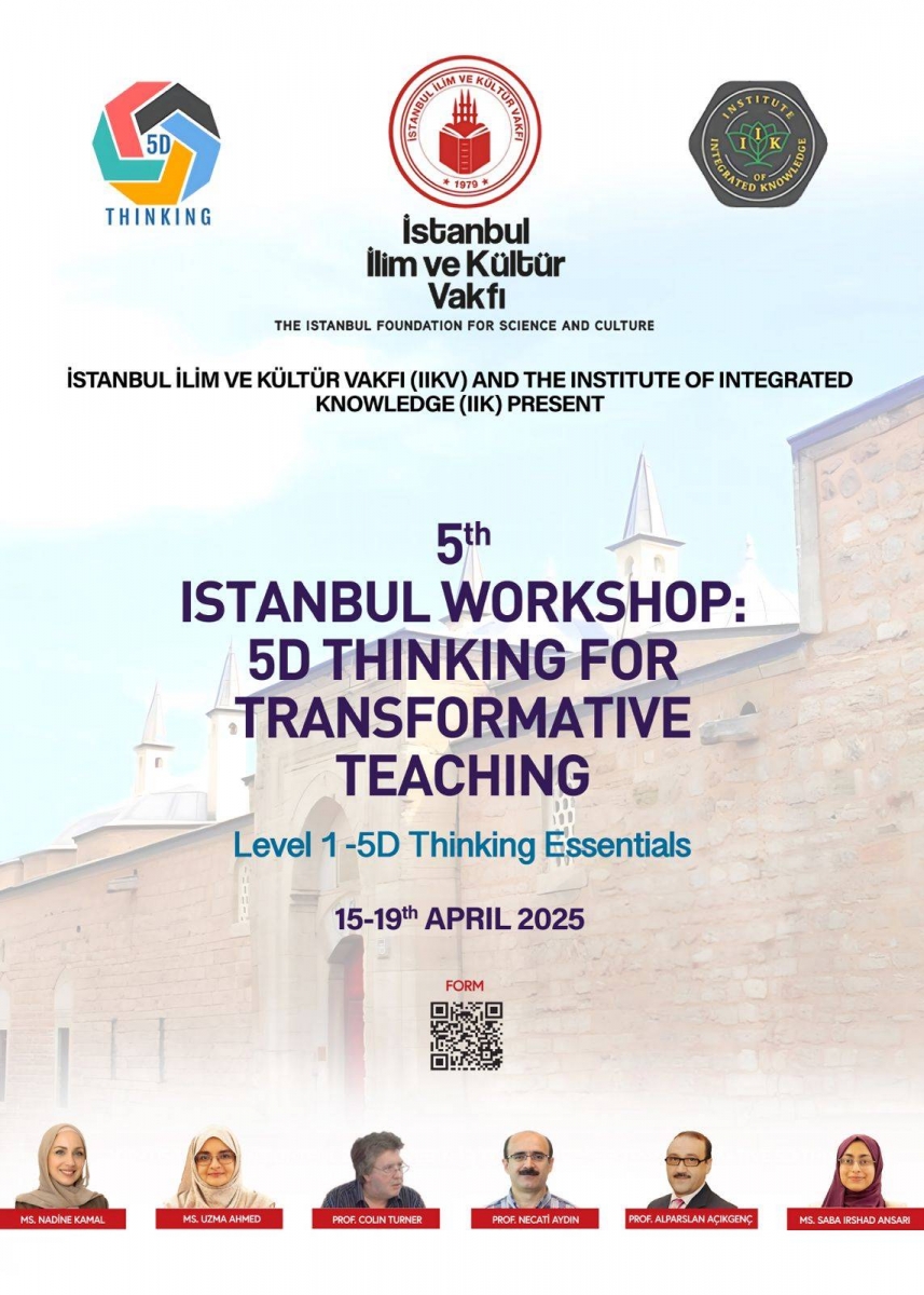 Geçtiğimiz yıl ÜÇ VE DÖRDÜNCÜSÜ başarıyla tamamlanan ve The Institute of Integrated Knowledge (IIK) iş birliğiyle düzenlediğimiz “ISTANBUL WORKSHOP: 5D THINKING FOR TRANSFORMATIVE TEACHING” çalıştayların beşincisi ve altıncısı, 2025 yılında da, geçen sene olduğu gibi art arda gerçekleştirilecektir. 2025 yılının ilk iki çalıştayı, 5-9 Nisan 2025 ve 15-19 Nisan 2025 tarihleri arasında yapılacaktır.