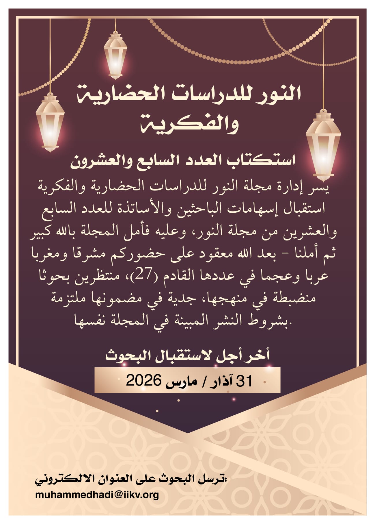 يسر إدارة مجلة النور للدراسات الحضارية والفكرية استقبال إسهامات الباحثين والأساتذة للعدد السابع والعشرين من مجلة النور، وعليه فأمل المجلة بالله كبير ثم أملنا - بعد الله معقود على حضوركم مشرقا ومغربا عربا وعجما في عددها القادم (27)، منتظرين بحوثا منضبطة في منهجها، جدية في مضمونها ملتزمة بشروط النشر المبينة في المجلة نفسها.