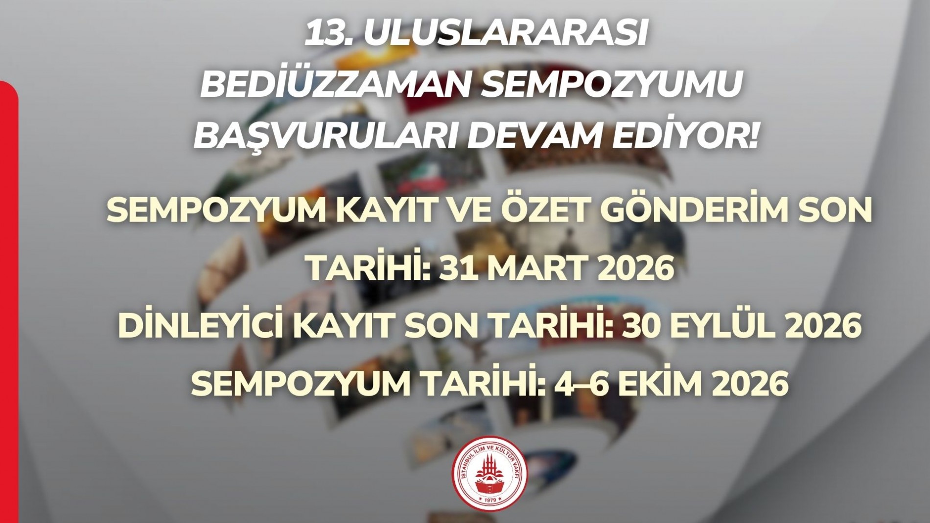 Vakfımız tarafından düzenlenen Uluslararası Bediüzzaman Sempozyumu’nun 13’üncüsü, 4–6 Ekim 2026 tarihlerinde İstanbul’da gerçekleştirilecek. Bu yıl “Küresel Krizlere Kur’ânî Çözümler” temasıyla düzenlenecek sempozyum, dünyanın gündemindeki insanî ve toplumsal sorunlara Kur’ân perspektifinden çözüm aramayı hedefliyor.