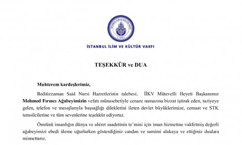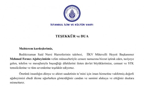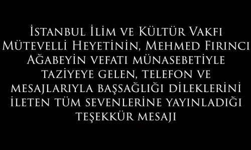 Mehmed Fırıncı Ağabeyimizin vefatı münasebetiyle taziyeye gelen, telefon ve mesajlarıyla başsağlığı dileklerini ileten tüm sevenlerine teşekkür ediyoruz